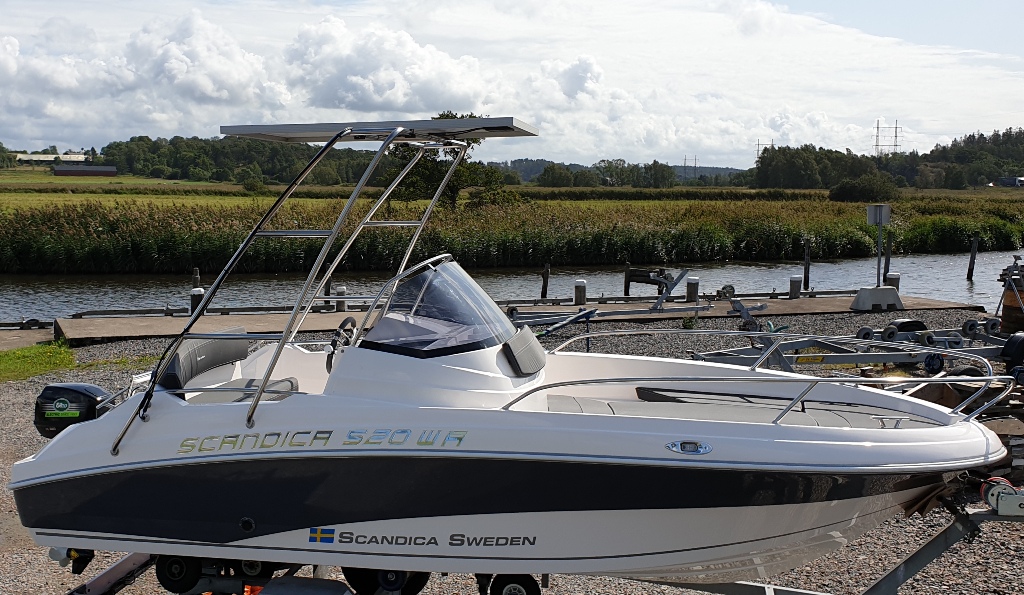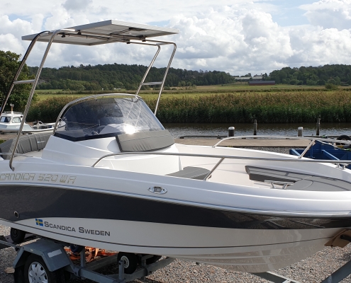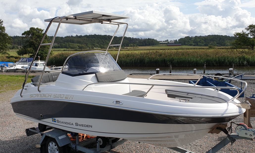 Båten är en Scandica 520 WA utrustad med Hybrid & Sol paket. Priset ca. 275.000